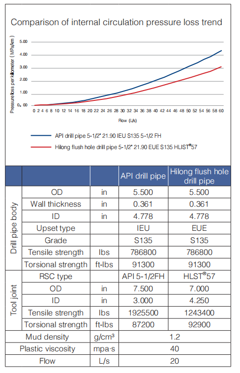 Decreasing the hydro pressure loss to improve the hydro-efficiency is the key to improve drilling speed. Shanghai Hilong's proprietary flush-hole drill pipe is designed to be made-up with the drill pipe body using a special external upset with a large ID and the tool joint with Hilong double shouldered connections with a large ID also. The ID of the upset end and the tool joint are almost the same as that of the drill pipe body.