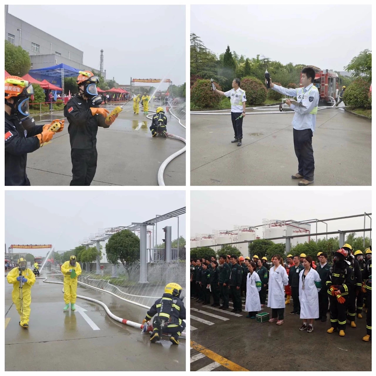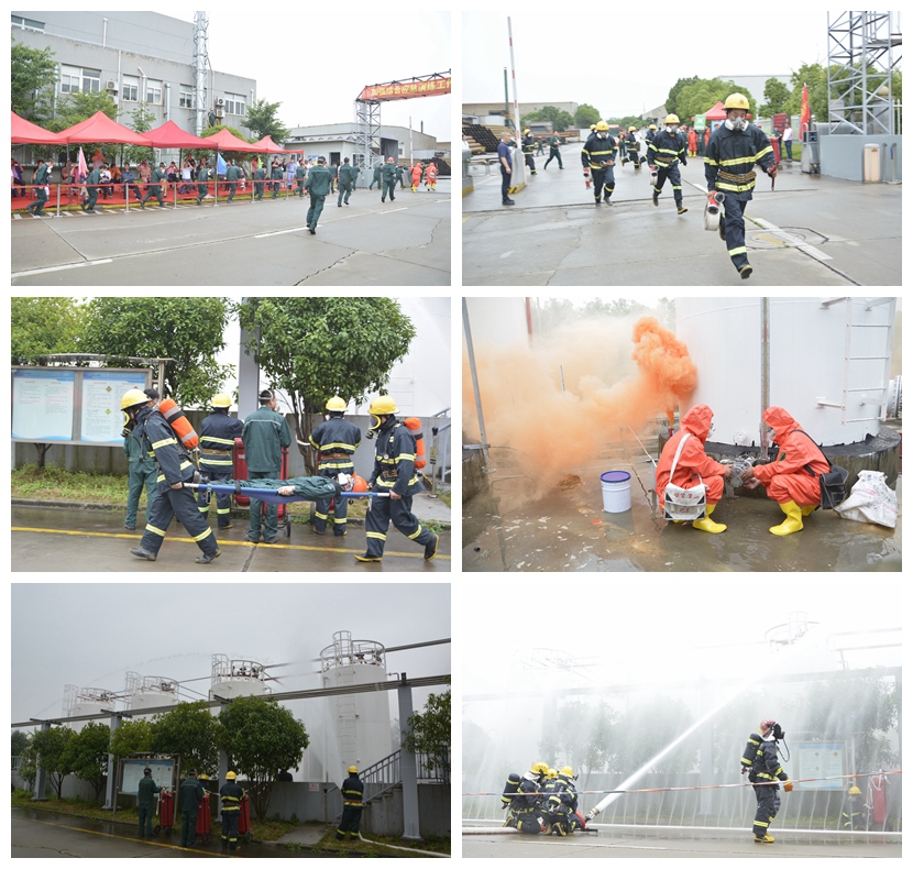 此次演練預(yù)設(shè)場景為海隆廠區(qū)甲類液體儲罐管道發(fā)生泄露,由于搶修不慎造成火災(zāi),火勢逐漸擴大、失去控制,同時有人員受傷,應(yīng)急預(yù)案隨之展開。疏散警戒組、物資保障組、通信聯(lián)絡(luò)組、設(shè)備保障組、環(huán)境偵檢組依次到場;消防和醫(yī)療人員展開滅火、被困人員解救和傷員救治工作,同步組織實施堵漏。由于現(xiàn)場火勢逐漸增強,消防撲救組請求政府救援力量處置,隨后寶山區(qū)110、119加大力量趕赴現(xiàn)場救援,共同將火勢控制下來。整個演練時間約15分鐘,演練流程順暢,環(huán)節(jié)緊湊,各小組表現(xiàn)優(yōu)異,圓滿完成了各項演練任務(wù)。